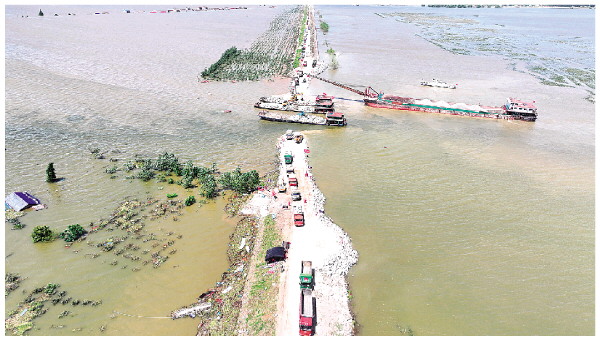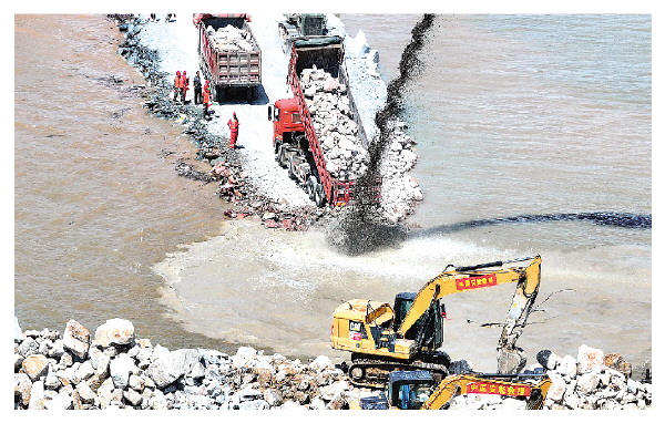 堤上,满载块石、砂卵石等物料的卡车,一趟接一趟地向水中卸料。水上,大型驳船轰鸣而来,将石料一轮轮抛投下。
