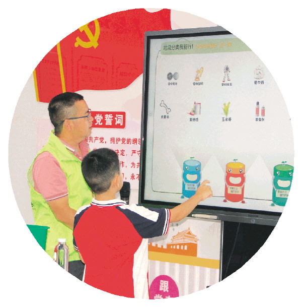 公益课堂上,中小学生积极参与生活垃圾分类模拟互动小游戏。
