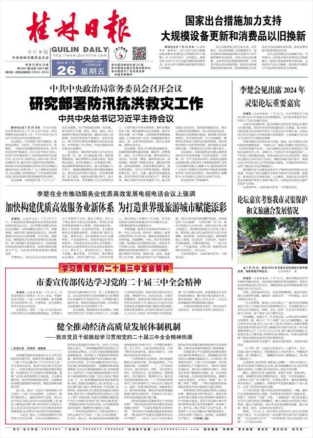 李楚强调,服务业在桂林经济发展中占据一半以上的比重,拼经济、稳增长,服务业要发挥更大拉动作用。要推动涉旅服务业加快恢复,把握暑期、中秋、国庆等消费黄金期,高质量办好灵渠国际论坛、桂林艺术节等重大活动,推动服务业持续提振复苏。要激发商贸领域消费活力,办好以旧换新、漓江购物节等活动,提振汽车、家电、商超等大宗消费。要促进房地产业平稳健康发展,用好住房贷款利率调整等政策,加快商品房“以旧换新”“以租代购”等工作。要全力培育壮大市场主体,深挖市场主体上规入统潜力,持续推动临规企业尽快上规入统。要对纳入重大项目清单的项目实行年度调整、滚动管理,加快项目建设。要积极围绕人工智能、低空经济、共享经济、电商平台等新赛道,实施专题招商、“一把手招商”、产业链招商,力争引进一批服务业领域的优质项目、名优企业。