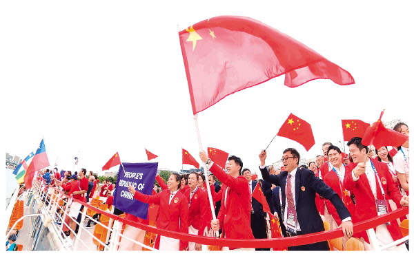 7月26日,中国体育代表团旗手、乒乓球选手马龙(前中)在开幕式前挥舞国旗。