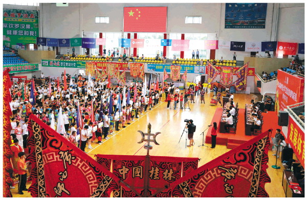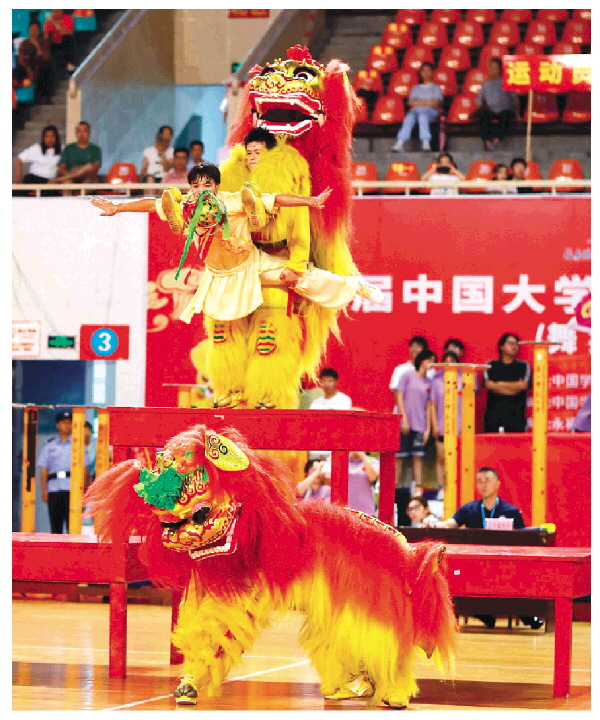 本报讯(记者刘教清 李忠波 通讯员刘玉婷)7月27日上午,第16届中国大学生舞龙舞狮锦标赛(舞狮项目)在永福县体育馆开赛,吸引了全国43所高等院校的600余名运动员、教练员参赛。