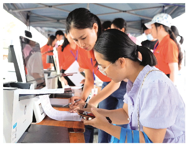 志愿者为献血者填写献血登记表。 记者何月 摄