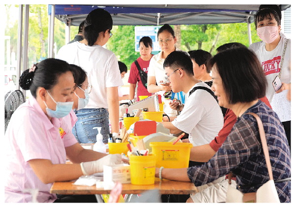上午9点,天空微微放晴,在激扬的音乐声中,来自市直机关工委、直属各单位、各医疗卫生单位的党员干部们精神抖擞,衣服上别着党员徽章,齐聚在广场上,阅读有关献血行动的科普海报,不少党员挽起衣袖,拍着手臂,展现着十足的献血热情。