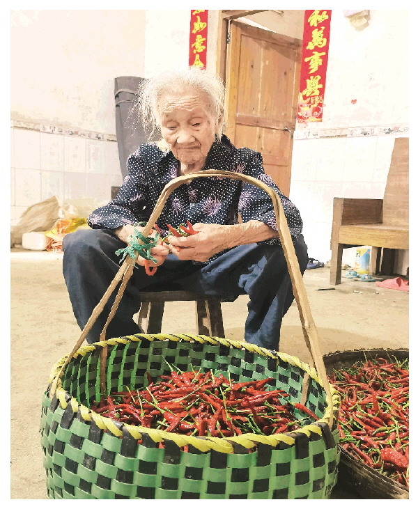 林三嫂帮着剪辣椒,她时常帮家人做一些力所能及的事。 记者刘菁 摄