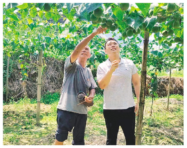 ▲廖凯君(右)在农户罗汉果果园了解挂果情况。
