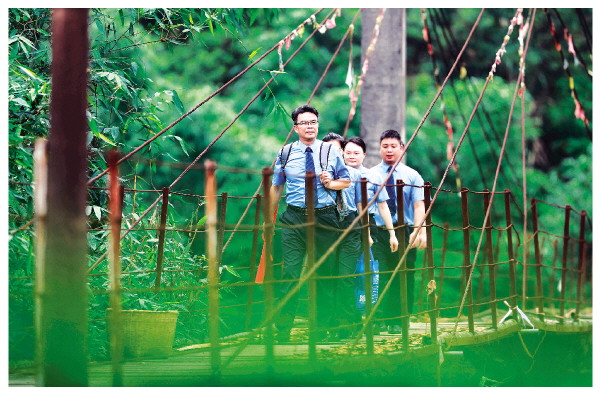 2022年6月7日,赖家明与永福县人民检察院“呵护未来”志愿服务队的队员们走在一座吊桥上,准备去一所乡村学校上法治课。