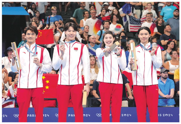 8月3日,亚军中国队选手杨浚瑄、张雨霏、覃海洋、徐嘉余(从右至左)在颁奖仪上。中国队以3分37秒55的成绩获得亚军并打破亚洲纪录。
