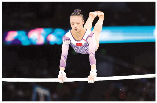 8月4日下午,巴黎奥运会体操女子高低杠决赛中,中国选手邱祺缘以15.500分获得银牌。阿尔及利亚选手内穆尔以15.700分夺得冠军。图为邱祺缘在比赛中。(来源:《人民日报》)