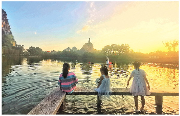 ◤8月4日,夕阳西下,塔山倒影在小东江江面上,晚霞映红了天空,孩童在岸边戏水,浆板划过清影,穿山公园显得惬意而美丽。