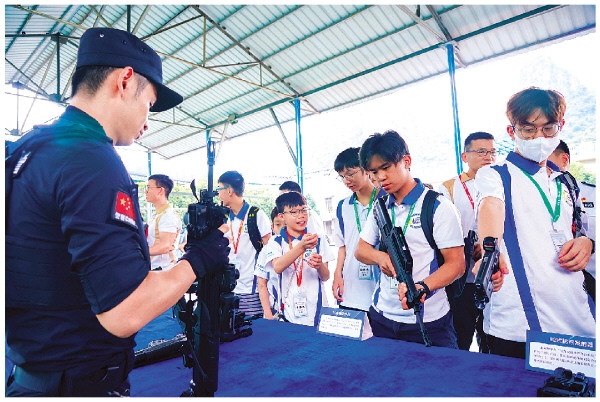 8月2日上午,香港警务处九龙城区少年警讯一行40余人到桂林市人民警察训练学校与桂林警方开展交流活动。此次活动旨在增进两地警方交流,同时让香港青少年了解内地警方维护治安的相关情况,感受桂林警察的警务技能和良好作风,活动分为装备展示、战术演练、互动交流等内容。图为香港少年警讯队员们在装备展区参观体验。邓宇 摄