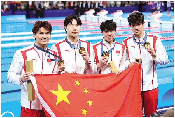 8月4日,中国队选手徐嘉余、覃海洋、孙佳俊、潘展乐(从左至右)在颁奖仪式后。