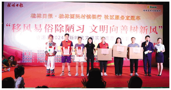 8月3日,桂林日报·桂林国民村镇银行社区服务直通车“移风易俗除陋习 文明向善树新风”暨“资源县2024年新时代文明实践志愿服务活动”在资源县政府广场举办。本次活动由桂林市文明办和桂林日报社联合主办,桂林国民村镇银行总冠名,资源县文明办、沈滩社区居民委员会、桂林国民村镇银行资源支行联合承办。当天,各行各业人士深入社区,提供优质服务,共同为文明乡风建设添砖加瓦。