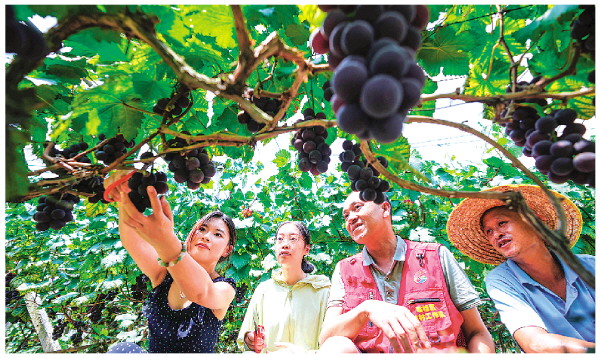 如何选到更好吃的葡萄呢?在临桂区四塘镇腊村,有着十几年种植经验的果农和驻村工作队员蹲守在果园里,为前来采摘葡萄的游客详细讲解选择什么颜色、什么形状的葡萄才是口感最好的,让游客获得更好的体验感。将近有40年种植历史的腊村巨峰葡萄品质、口感深受桂林本地市场欢迎。