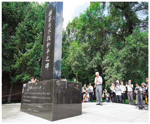 8月13日,侵华日军第七三一部队“少年队”原队员清水英男在侵华日军第七三一部队旧址“谢罪与不战和平之碑”前忏悔谢罪。新华社记者王建威 摄