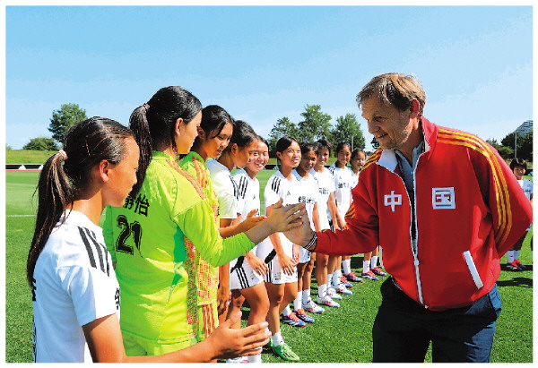 8月12日,在德国黑措根奥拉赫,“雏凤计划”女足小球员在训练后与阿迪达斯全球首席执行官比约恩·古尔登击掌。 新华社记者 杜哲宇 摄