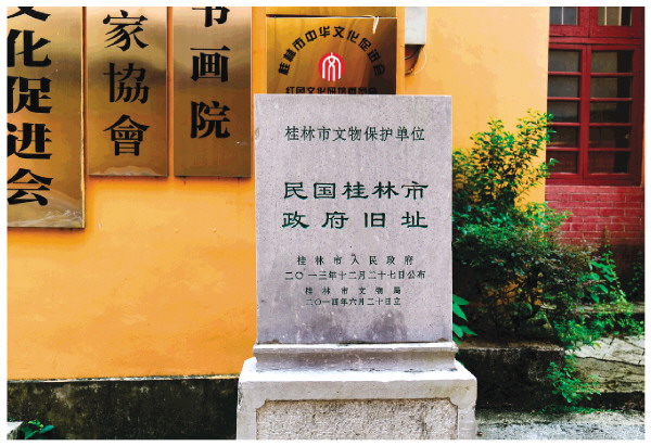 如今走进这个大院,很容易被这一栋颇具历史感的建筑吸引,在这栋建筑前立有一块石碑,上面标注着“桂林市文物保护单位”以及“民国桂林市政府旧址”的字样。这栋建筑具有中西结合的特征,面宽34.8米,深20.8米,为砖木结构的三层楼房,小青瓦坡屋顶。内部走廊居中,呈对称筒子楼布局。外墙为黄红相间的色调,开木质小格窗。