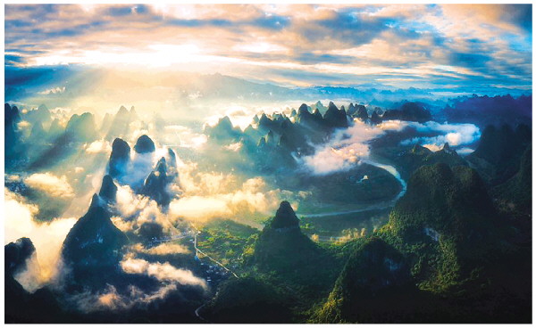 桂林喀斯特以漓江及其支流周边的塔状及锥状岩溶地貌为主要特征,同时发育有许多洞穴,展现了峰林和峰丛岩溶形态的共存和相互作用。奇特的峰林、峰丛,清澄的水流,嶙峋的崖壁,瑰丽的洞穴,既构造出“甲天下”的桂林山水,也是具有重大科研价值的地质瑰宝。 黄一骏 摄