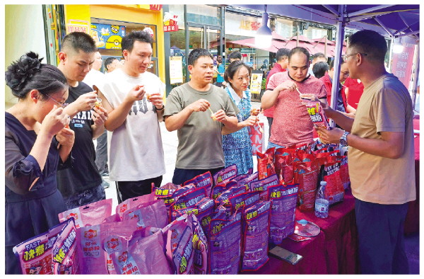 8月初,广西一刻钟便民生活服务消费季桂林专场活动在高新万达广场举行。图为一些市民在米粉企业摊位品尝米粉。记者徐莹波 摄