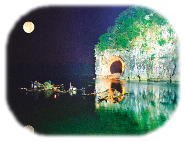 漓江西岸的象鼻山水月洞与东岸的穿山月岩相对,一挂于天,一浮于水,形成“漓江双月”的奇特景观。这一自然奇观也让历代文人墨客为之赞叹,宋朝蓟北处士曾在象鼻山写下《和水月洞韵》一诗:“水底有明月,水上明月浮。水流月不去,月去水还流。”这首诗细致描绘了皓月当空,天上月、洞中月、水底月三月争辉的奇景。