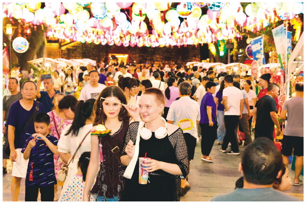 ◤9月15日晚,在两江四湖景区古南门前,各色花灯点亮,与天空皓月相映衬。中外游客在花灯下畅游,欢度假日。 记者李凯 摄