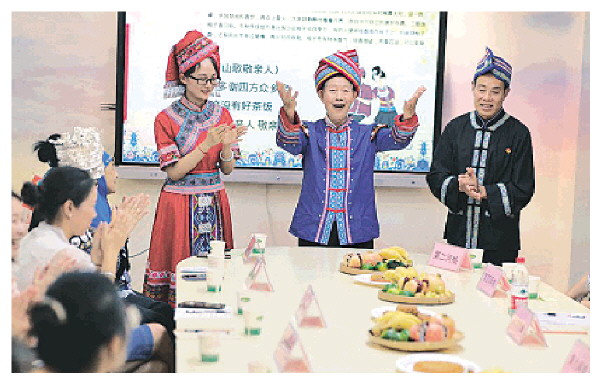 ◤中秋前夕,七星社区举办茶话会,邀请各族居民参加。会上,少数民族居民即兴唱起了山歌,民族团结氛围浓厚。 记者韦莎妮娜 摄