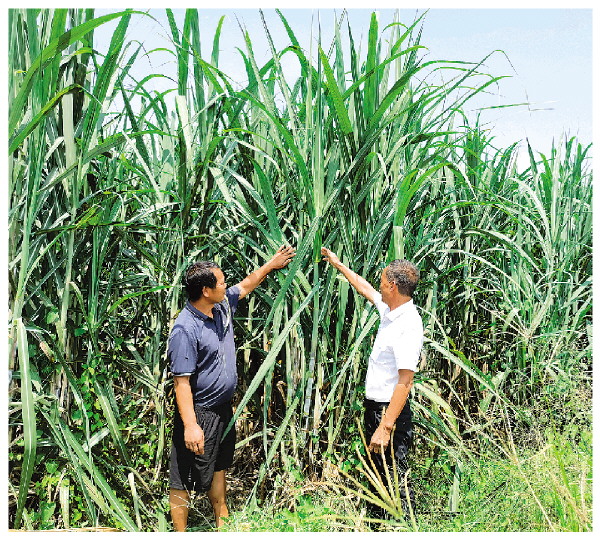 李章书和黄继旺查看糖料蔗长势。 记者刘菁 摄