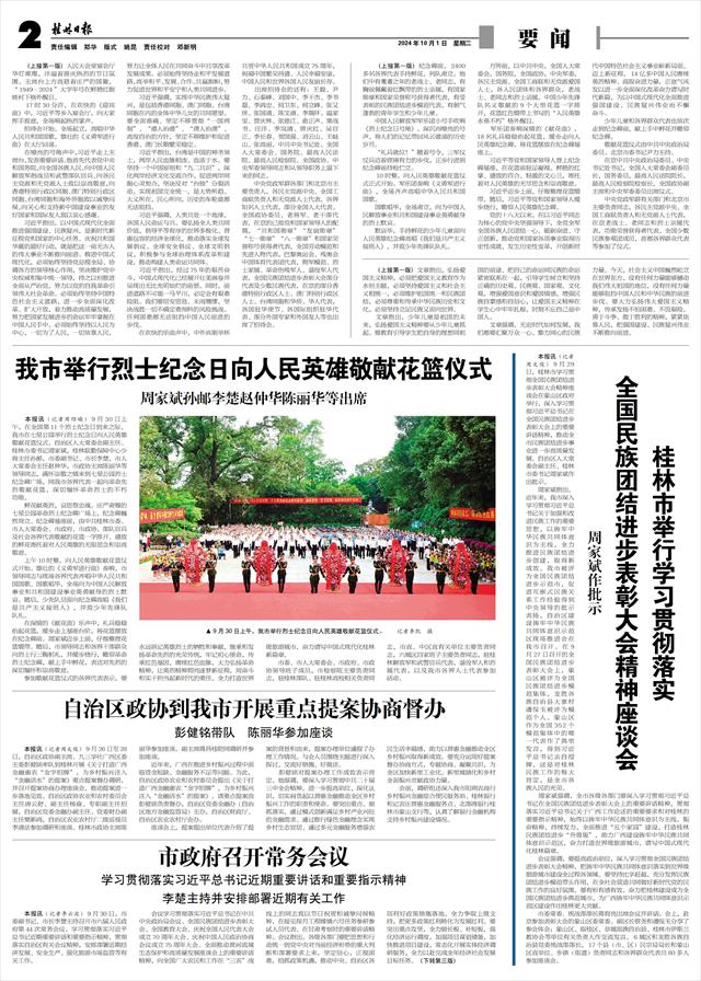 全国民族团结进步表彰大会精神座谈会 周家斌作批示   本报讯(记者周文俊)9月29日,桂林市学习贯彻全国民族团结进步表彰大会精神座谈会在象山区政府举行,深入学习贯彻习近平总书记在全国民族团结进步表彰大会上的重要讲话精神,推动全市民族团结进步事业进一步高质量发展。自治区人大常委会副主任、桂林市委书记周家斌作出批示。