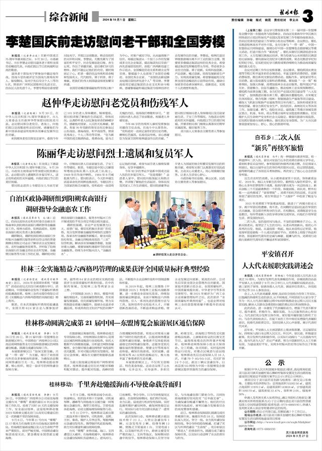 赵仲华走访慰问老党员和伤残军人   本报讯(记者陈娟)9月30日,在中华人民共和国75周年华诞前夕,市人大常委会主任赵仲华带领慰问组到灵川县,走访慰问部分老党员、老战士,向他们致以崇高敬意和亲切问候,感谢他们为新中国革命建设和桂林各项事业发展作出的贡献。