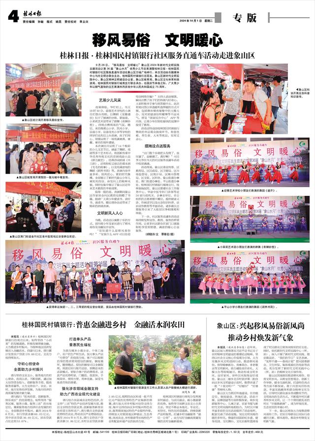 移风易俗 文明暖心 桂林日报·桂林国民村镇银行社区服务直通车活动走进象山区   9月28日,“移风易俗 文明暖心”象山区2024年新时代文明实践主题活动之第36届“象山水月”优秀少儿节目展演暨桂林日报·桂林国民村镇银行社区服务直通车活动在象山区万福广场举行。本次活动由市融媒体中心与市文明办联合主办,桂林国民村镇银行总冠名,象山区新时代文明实践中心、象山区精神文明建设办公室、象山区教育局、象山区文化体育和旅游局、桂林国民村镇银行城南支行联合承办。在国庆节来临之际,广大青少年以朝气蓬勃的文艺展演热烈庆祝中华人民共和国成立75周年。