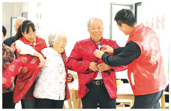 ▲10月10日,山东省临沂市郯城县郯城街道府东社区志愿者为老人试穿新衣。 新华社发(张春雷 摄)