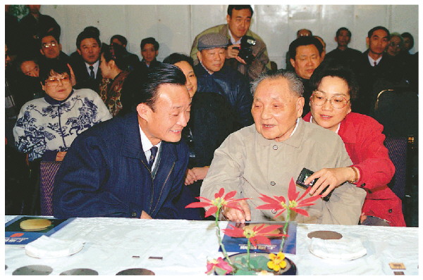 1992年2月10日,邓小平同志在上海贝岭微电子制造有限公司参观时与吴邦国同志交谈。 新华社记者柳中央 摄