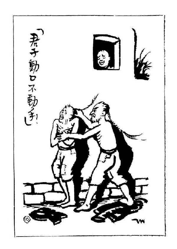 此处还有一个习惯,吃饭用的桌凳很低矮,冬天一家人围着桌子吃饭,桌子中间开一个大圆洞,洞下生火炉,火炉上放着大铁锅,边煮边吃。老百姓热情好客,逢年过节常邀丰子恺一家去聚餐。他觉得既暖和又入味,便记下并插画留念。