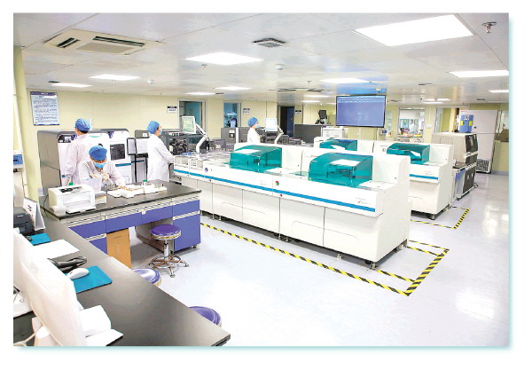 记者来到市人民医院门诊楼三楼,透过走廊橱窗看到:检验人员忙碌在各类大型的设备之间接收标本、录入信息、仪器准备、质量控制、上机检测、核发报告……整个科室正在高速有序运转。