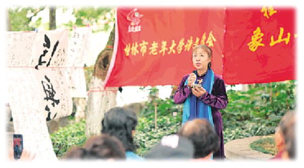 ◥日前,市象山诗社、市老年大学诗文学会和古典诗词班的诗友们在杉湖北岸的树荫下举行了一场别开生面的诗歌朗诵会。上到九十岁的耄耋老人,下到刚退休的老人,大家以诗会友,朗诵自己写的诗歌,讴歌新时代中华盛世,寄托家国情怀。