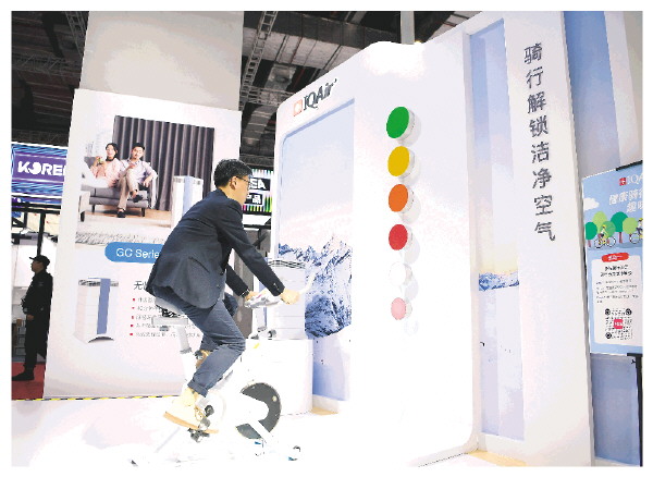 ▲11月5日,一名男子在进博会消费品展区参与“骑行解锁清洁空气”活动。