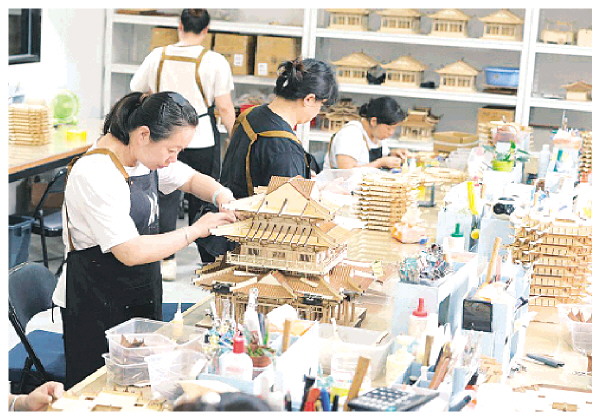 今天,在石荣敏的模型工厂里,十多台切割机忙碌地运转着,激光刀头在木板上刻出图样,这些木板又根据模型款式被分类集中到仓库中,被打包发往全国。在一侧的工作间里,十来位女工专注手头模型拼装的活计,一些装配更复杂的古建筑模型也将从这里被整体打包送往各地。