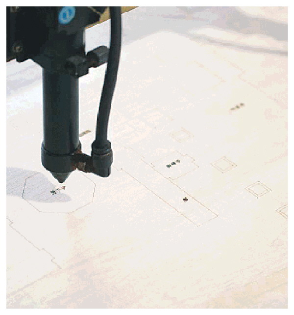 图⑤:模型工厂里,激光雕刻机在木板上刻出图样。