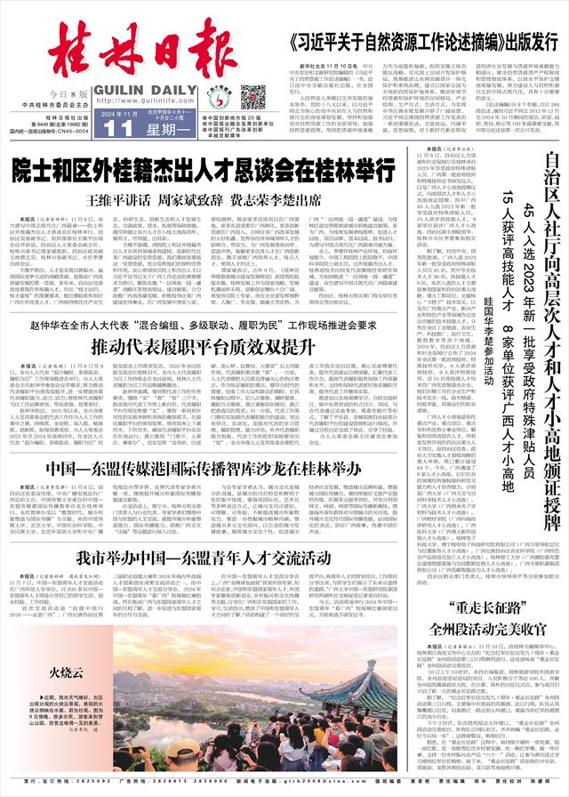 周家斌表示,去年9月,《桂林世界级旅游城市建设发展规划》获国务院批复实施,桂林发展上升为国家战略,发展机遇前所未有,创新创业舞台十分广阔。希望各位院士专家、各位企业家发挥视野宽、人脉广、专业强、能量大等优势,为广西“一区两地一园一通道”建设、为桂林打造世界级旅游城市积极建言献策,多为广西、为桂林发展牵线搭桥,促进人才回桂、项目回移、资本回流、技术回归,为谱写中国式现代化广西篇章贡献力量。