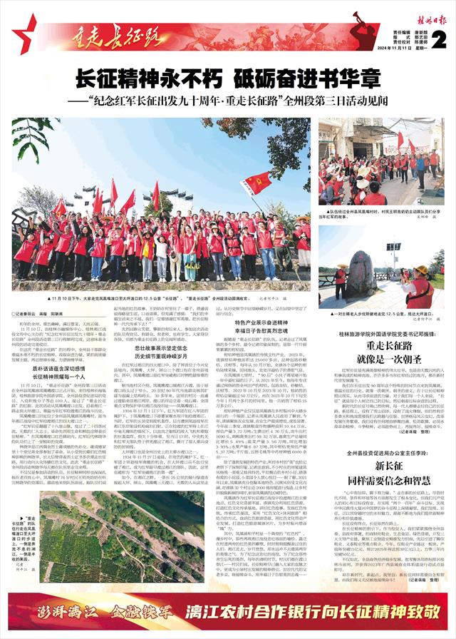 本报讯(记者秦丽云)11月10日,由桂林市融媒体中心、桂林湘江战役文传中心主办的“纪念红军长征出发九十周年·重走长征路”全州段活动第三日行程顺利进行。这也意味着“重走长征路”全州段活动完美收官。