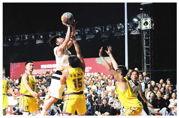 果然一上场,双方便迅速展开真刀真枪的争夺。贴身防守、突破上篮、飞身大帽、远投三分……一系列快节奏、眼花缭乱的精彩攻防,让现场观众看得惊叹连连,大呼过瘾。不过,前两节主场作战的水滨村队稍显紧张,以26比41落后。