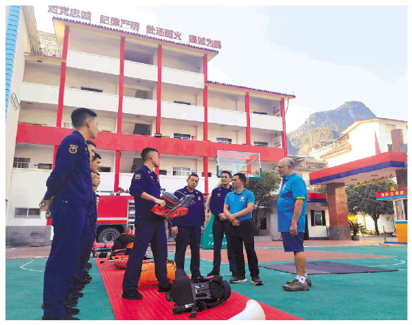 本报讯(记者陈静 通讯员张强)“What’s wrong with you?What kind of help do you need?”11月11日下午,桂林市阳朔县消防救援大队里传来阵阵英语对话。当天该大队邀请县里对外交流培训的美国老师Nat Wolins到队里开展消防救援日常英语口语学习活动。