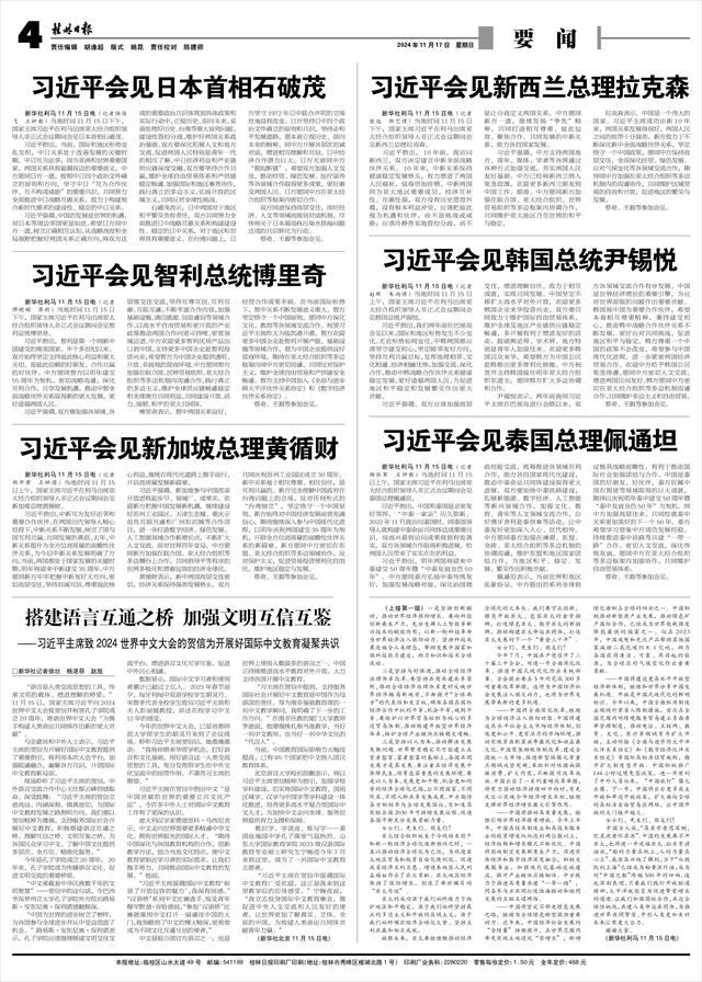 习近平分别会见日本首相石破茂、新西兰总理拉克森、智利总统博里奇、韩国总统尹锡悦、新加坡总理黄循财、泰国总理佩通坦   (详见第四版)