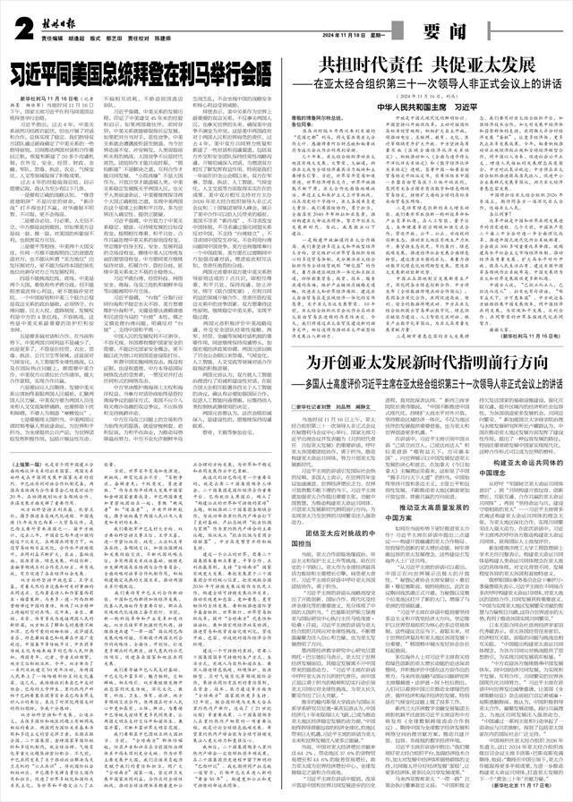 三是树牢普惠包容的亚太发展理念。要加强经济技术合作,加大对发展中经济体和弱势群体的支持,共同做大并分好经济发展“蛋糕”,让更多经济体、更多民众共享发展成果。中方将在亚太经合组织推进提高居民收入、促进中小企业集群式发展等倡议,助力亚太经济普惠包容发展。中国将担任亚太经合组织2026年东道主,期待同各方一道深化亚太合作,造福亚太人民。