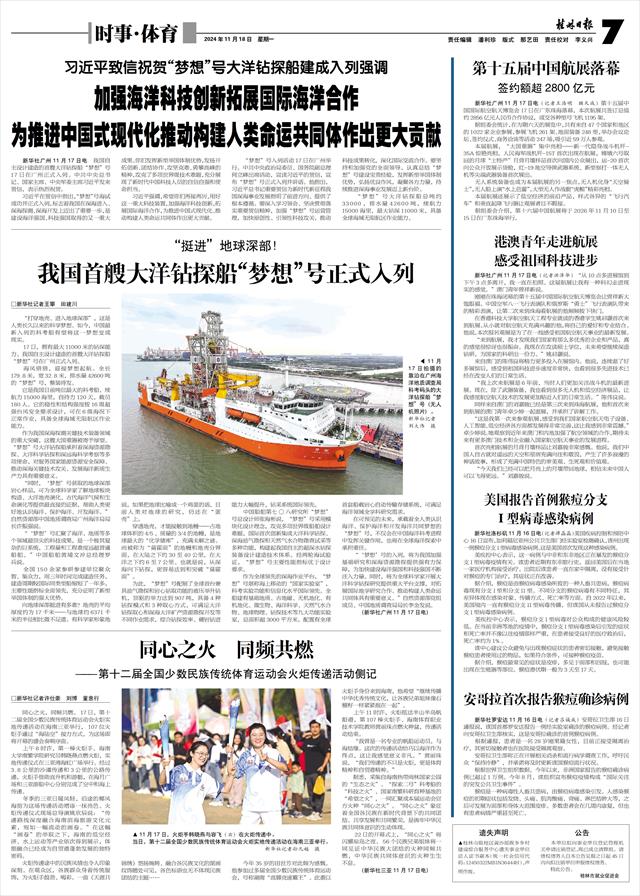 “梦想”号入列活动17日在广州举行。中共中央政治局委员、国务院副总理何立峰出席活动,宣读习近平的贺信,宣布“梦想”号正式入列并讲话。他指出,习近平总书记重要贺信为新时代新征程我国深海事业发展指明了前进方向、提供了根本遵循。要深入学习领会、坚决贯彻落实重要贺信精神,加强“梦想”号运营管理,加快原创性、引领性科技攻关,推动科技成果转化,深化国际交流合作。要坚持和加强党的全面领导,认真总结“梦想”号建设宝贵经验,发挥新型举国体制优势,弘扬优良作风,凝聚各方力量,持续推进深海事业发展迈上新台阶。