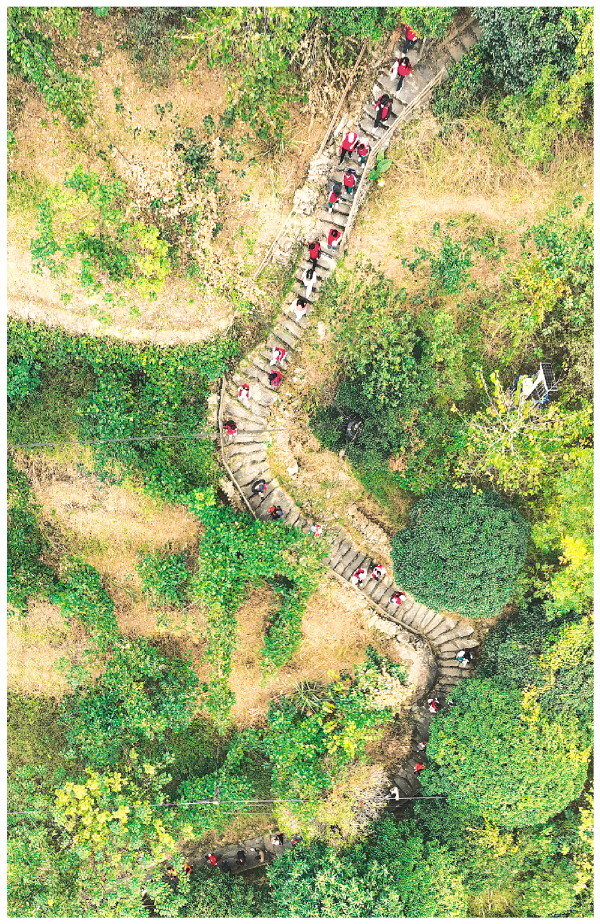 ◥队伍沿着白面瑶寨的石阶向山坡上前进。