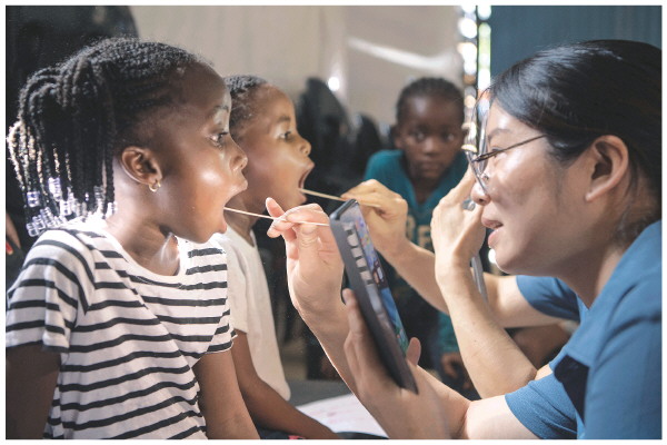 ◥11月20日,在纳米比亚首都温得和克附近的弗兰斯艺术培训中心,中国医生给孩子们进行口腔健康检查。