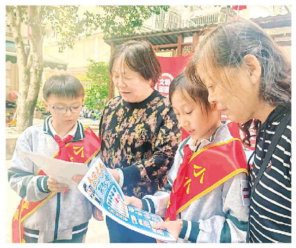 ▲桂林市宝贤小学的孩子们向社区居民宣传交通安全知识 (桂林市宝贤小学供图)