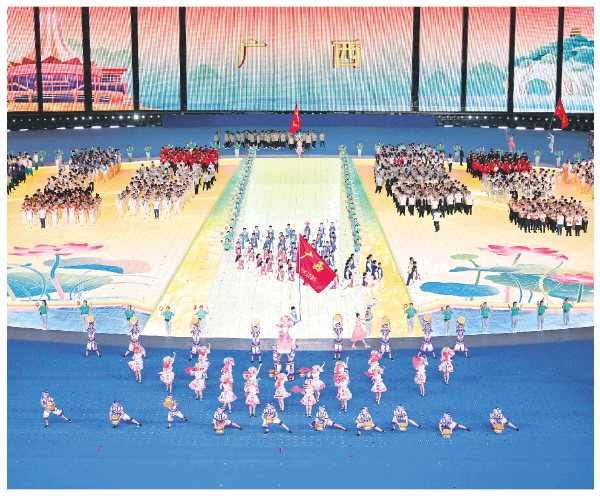 ▲11月22日,广西壮族自治区代表团在开幕式上入场。 新华社记者郭程 摄