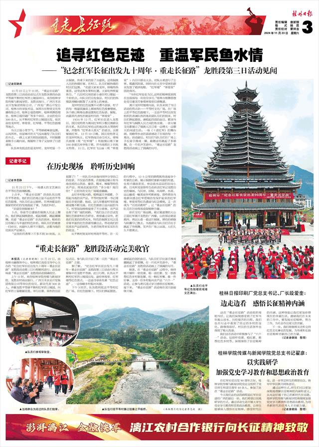 本报讯(记者唐健扬)11月22日,由桂林市融媒体中心、桂林湘江战役文传中心主办的“纪念红军长征出发九十周年·重走长征路”龙胜段活动第三日行程顺利进行。这也意味着“重走长征路”龙胜段活动圆满收官。