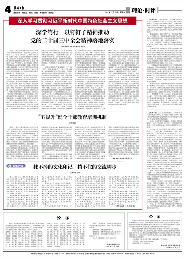 党的二十届三中全会通过的《中共中央关于进一步全面深化改革、推进中国式现代化的决定》(以下简称《决定》),聚焦中国式现代化主题,对进一步全面深化改革作出系统部署,提出300多项重大改革举措。发展改革部门作为宏观调控和经济综合部门,既是“参谋部”也是“作战部”,我们将聚焦《桂林世界级旅游城市建设发展规划》实施,坚持宏观着眼、微观着手,以钉钉子精神推动各项改革发展任务落地落实,切实将党的二十届三中全会作出的改革部署,转化为推动桂林高质量发展的强大动力和实际成效。